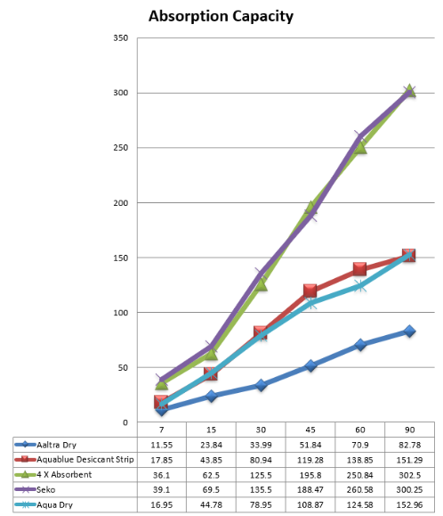 Comparison chart of Moisture Absorption done by ‘Container Desiccant’ product against Silica Gel and Clay.
